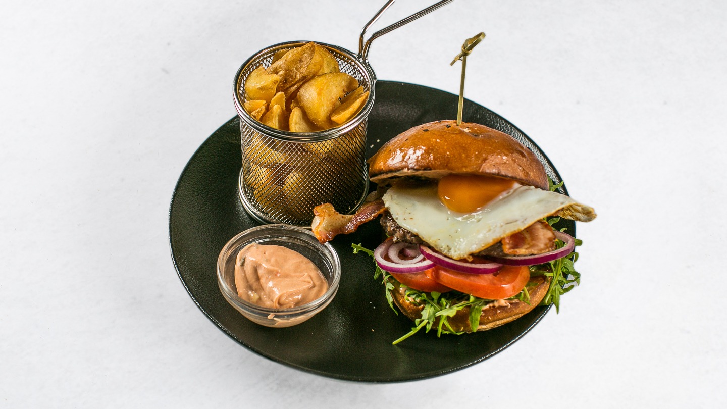 Gorčicabombica s sezamom, govedina, paradižnik, solata, čedar sir, sveža čebula, slanina, jajce, krompirček, omaka