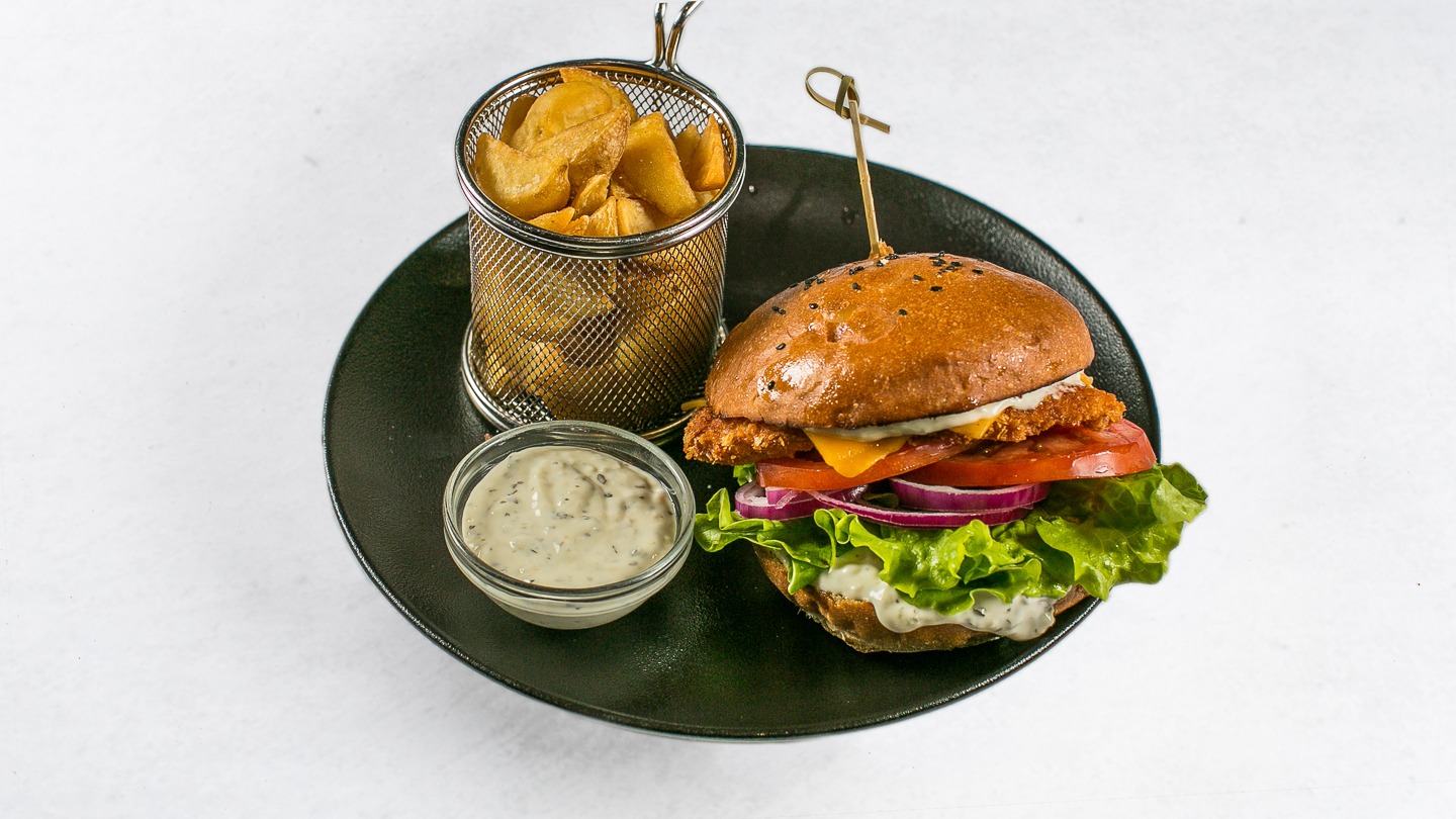 bombica s sezamom, ocvrta piščančja prsa, paradižnik, solata, čedar sir, zelje, krompirček, omaka