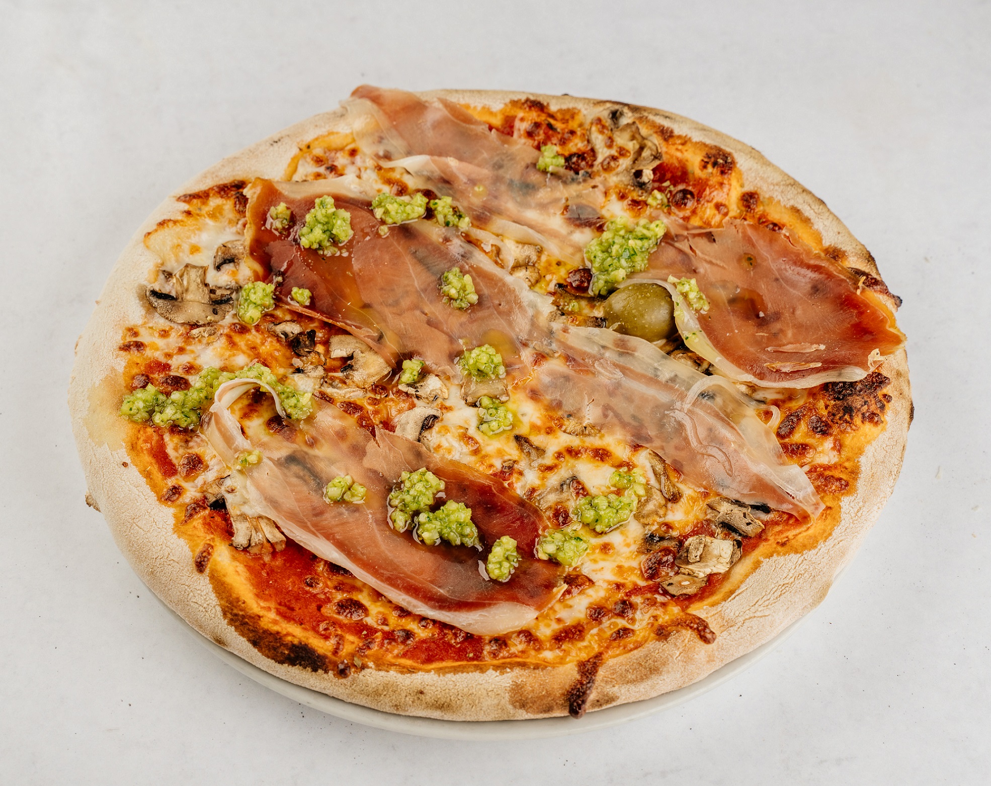 pelati, mozzarella, gobe, pršut, tržaška omaka, origano, oliva