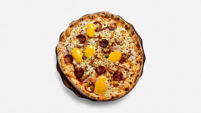 pelati, mozzarella, kuhan pršut, kulen, slanina, nacho sir, origano, oliva